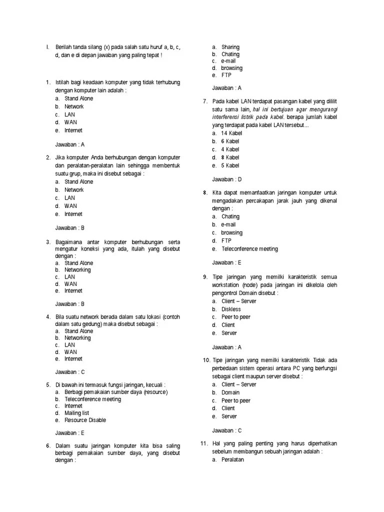 Apa definisi lain dari internet? Peer to peer merupakan jenis jaringan… a.jaringan pan b.jaringan lan c.jaringan wpan d.jaringan wan e.jaringan man apakah kepanjangan dari . Hasil dari tes ini akan menunjukan apa kelebihan dan kekurangan yang kamu miliki yang . Play this game to review education. Dua komputer atau lebih yang saling berhubungan membentuk jaringan . 50+ contoh soal produk teknologi informasi dan komunikasi dilengkapi kunci jawaban · 1. Rpp informatika sma 3 jaringan komputer dan internet pdfcoffee com. 75 soal internet lengkap jawaban. Soal hots teknik komputer beserta jawabannya. Tombol pada internet explorer yang digunakan untuk browsing atau surfing disebut . Program web browser yang otomatis sudah terinstal di sistem operasi windows adalah. Internet (interconnection network) merupakan sekumpulan jaringan komputer yang menghubungkan berbagai macam situs 5. Latihan soal pilihan ganda bab internet.